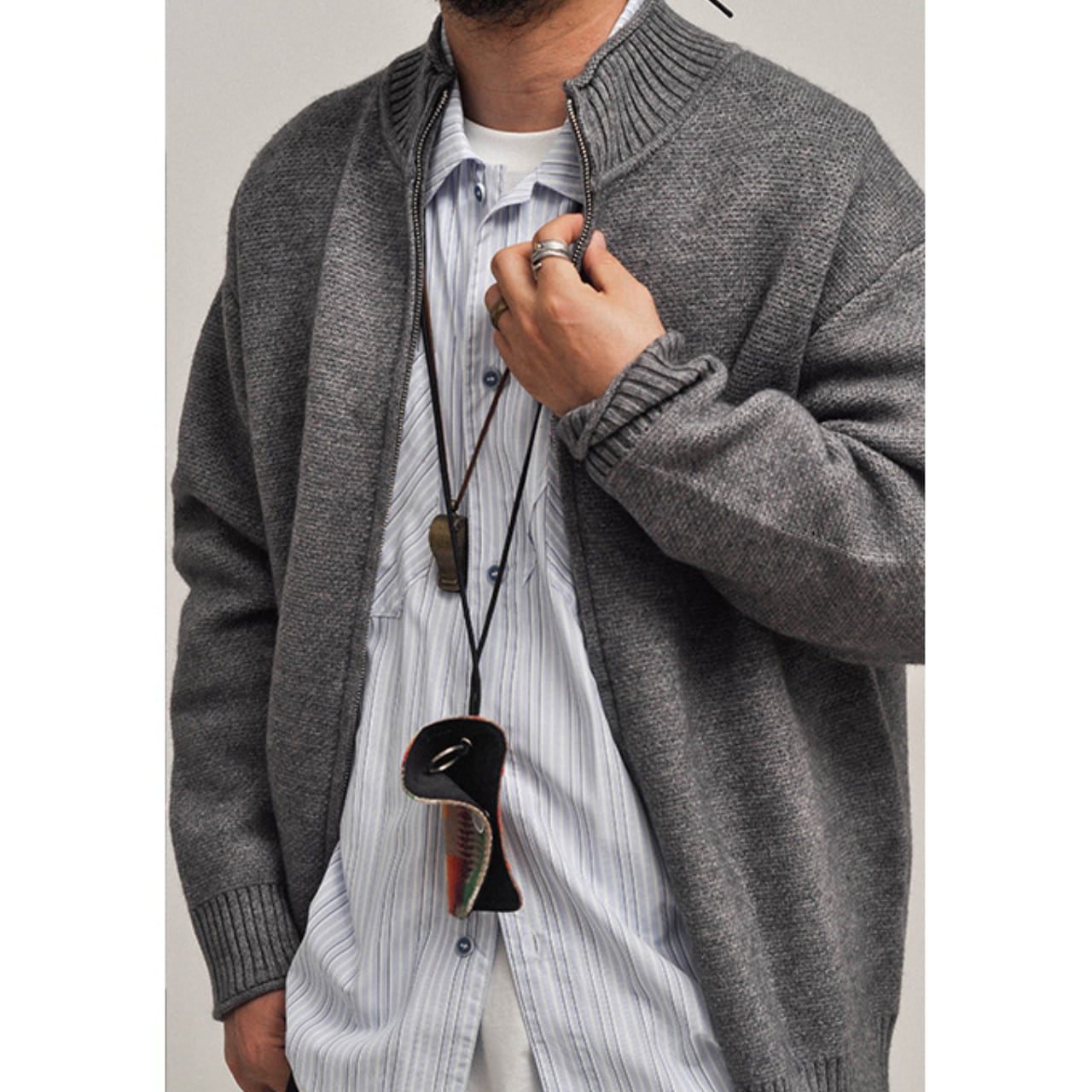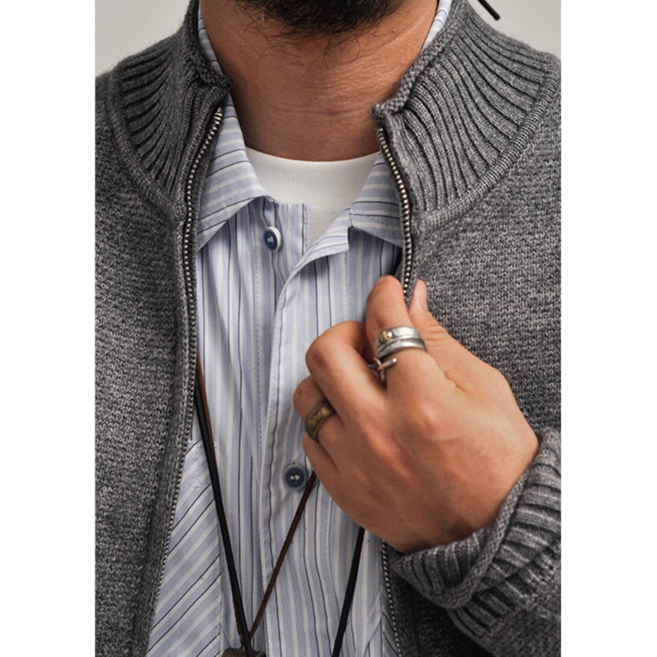 首元までしっかりと立ち上がるリブ編みのスタンドカラーが、