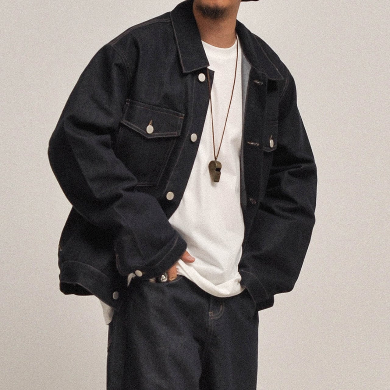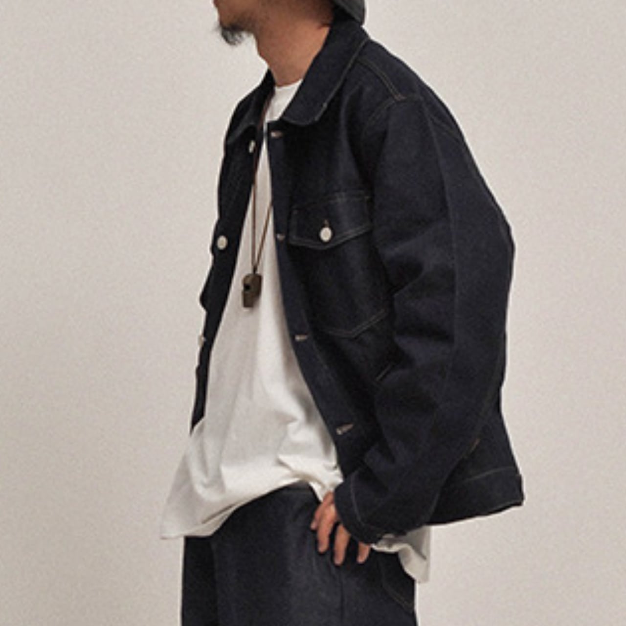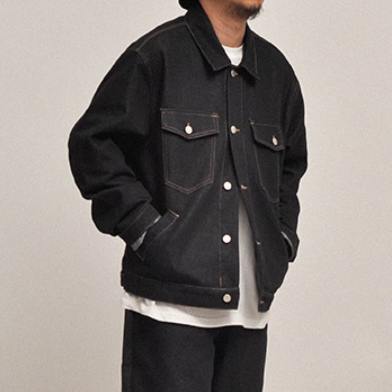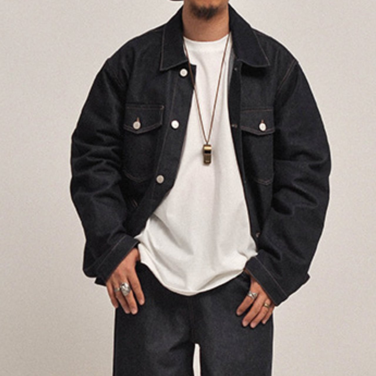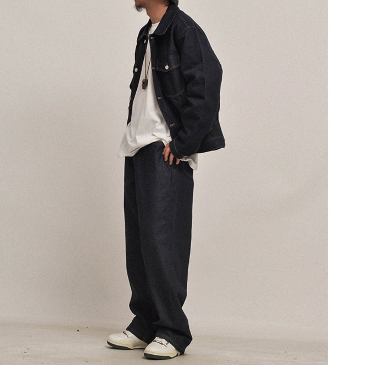 インナーの白Tシャツやスウェットとのコントラストが映えます。