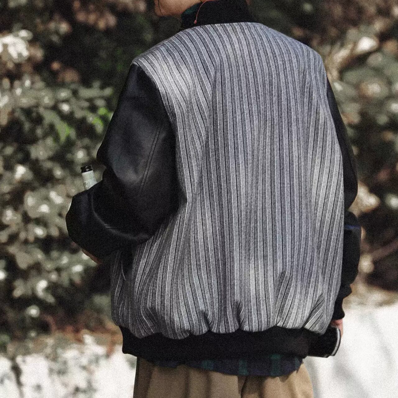都会的でシンプルなストライプスタジアムジップアップジャケットは、